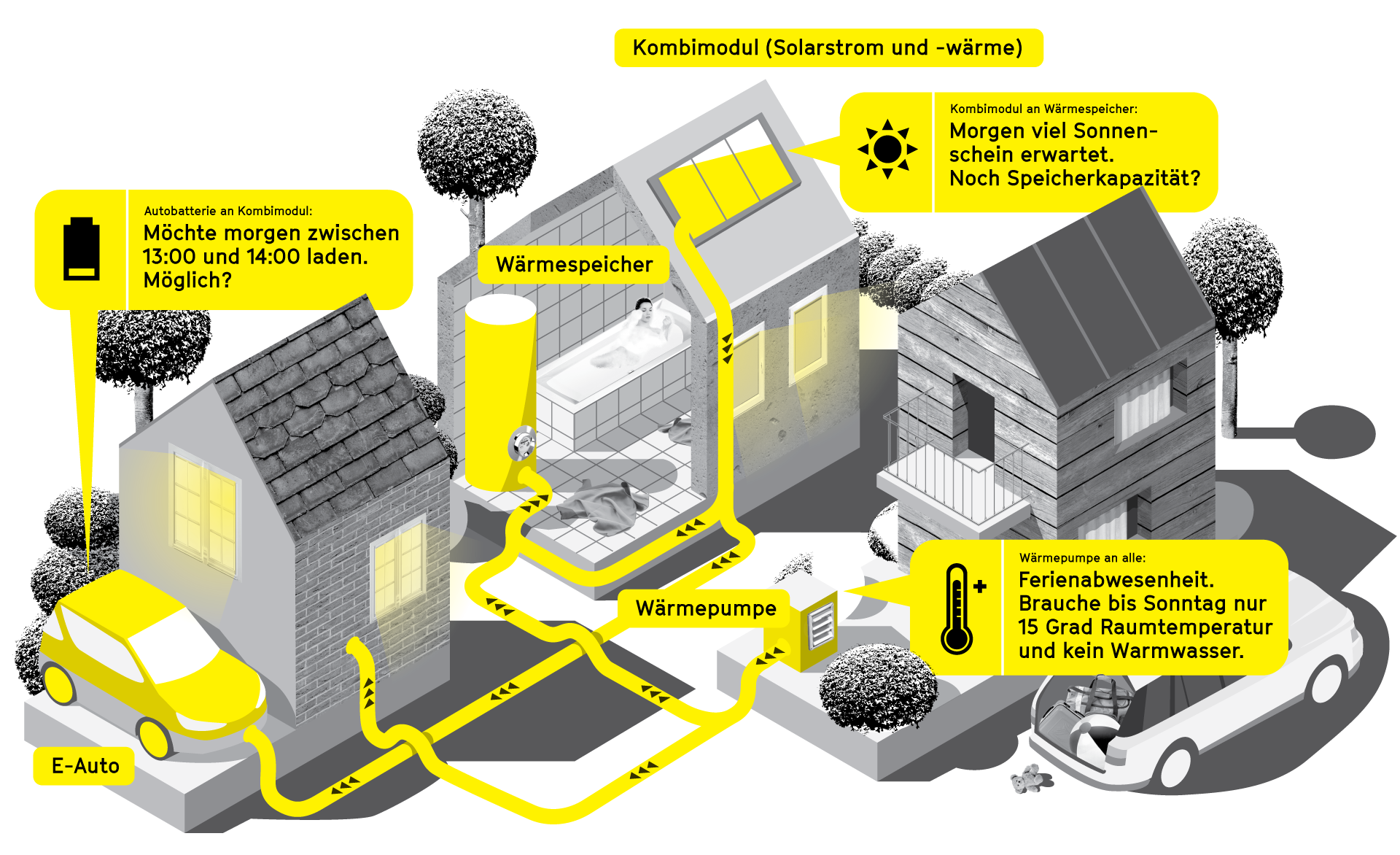 In einem Microgrid, das Energieerzeuger und -verbraucher lokal vernetzt, geht es zu wie in einer guten Nachbarschaft: Man nimmt Rücksicht aufeinander und stimmt sich ab. Solaranlagen, Wärmepumpen, Heizungen, E-Fahrzeuge, Speicher und Waschmaschinen stehen in ständigem Kontakt und tauschen Daten aus, um Energie optimal zu nutzen.